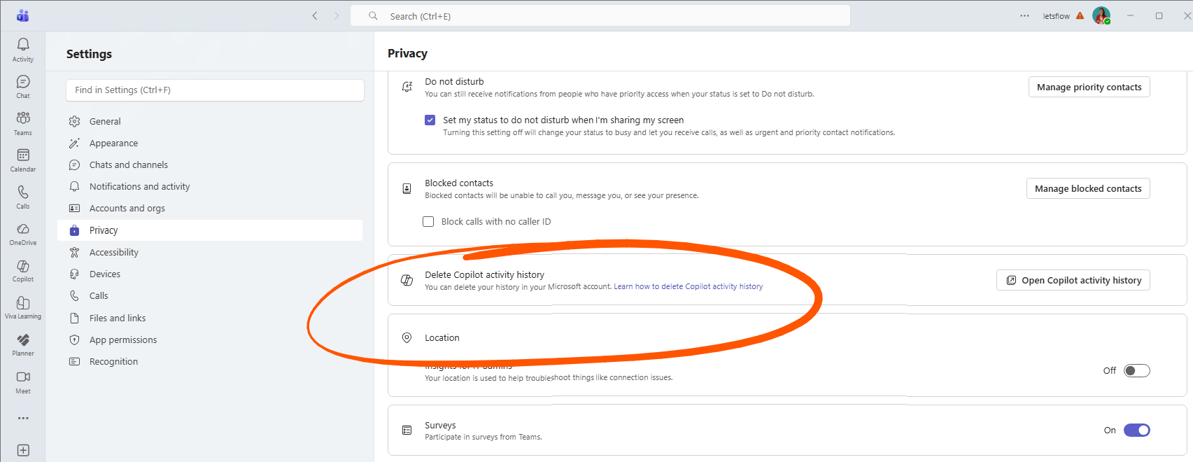 1️⃣ Go to Teams >> Settings >> Privacy